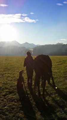 Bei diesen Spaziergängen geht es aber nicht nur darum das Vertrauen zu stärken, sondern auch um am Grundgehorsam des Hundes zu arbeiten. Denn was viele nicht beachten ist es doch für den Hund ein großer Unterschied, ob er vom Boden aus angeleitet wird oder vom Pferd. Viele Hunde hören leider kaum mehr, sofern sich der Reiter einmal aufs Pferd begibt da es für sie eine völlig andere Situation darstellt. Da grade beim Hund sämtliche Kommandos unbedingt generalisiert werden müssen, werden so auf dem Rücken des Pferdes Kommandos neu einstudiert, die auf dem Boden bereits aus dem FF klappten!