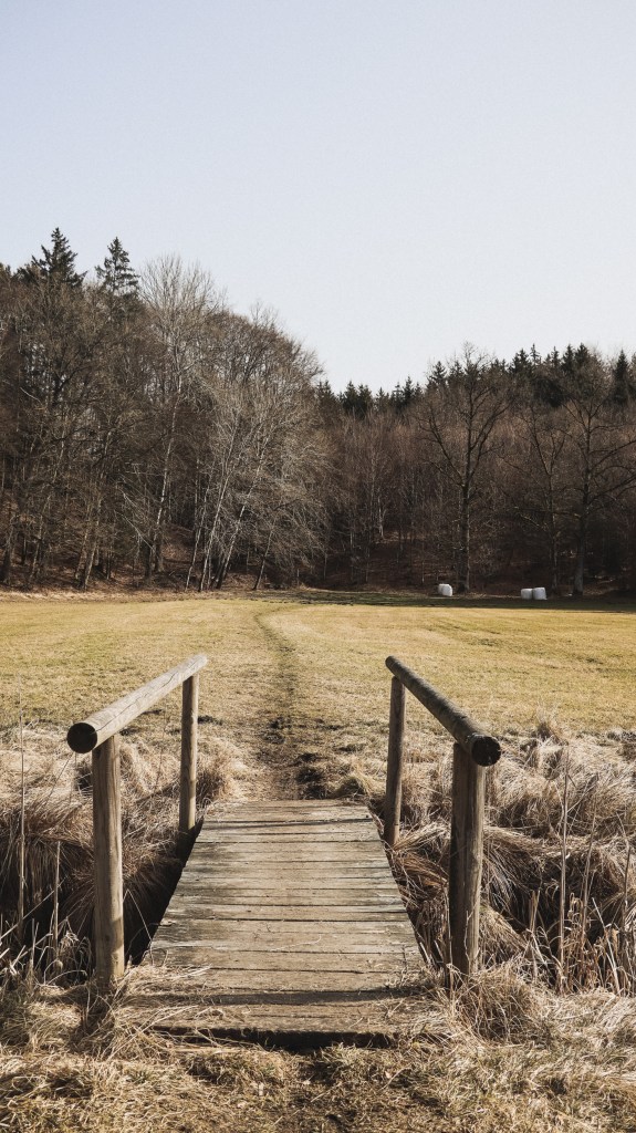 Eine kleine Brücke führt nun über einen kleinen Bachlauf durch die idyllische Landschaft. Nach der Brücke geht man wieder geradeaus weiter und gelangt in den angrenzenden Wald.