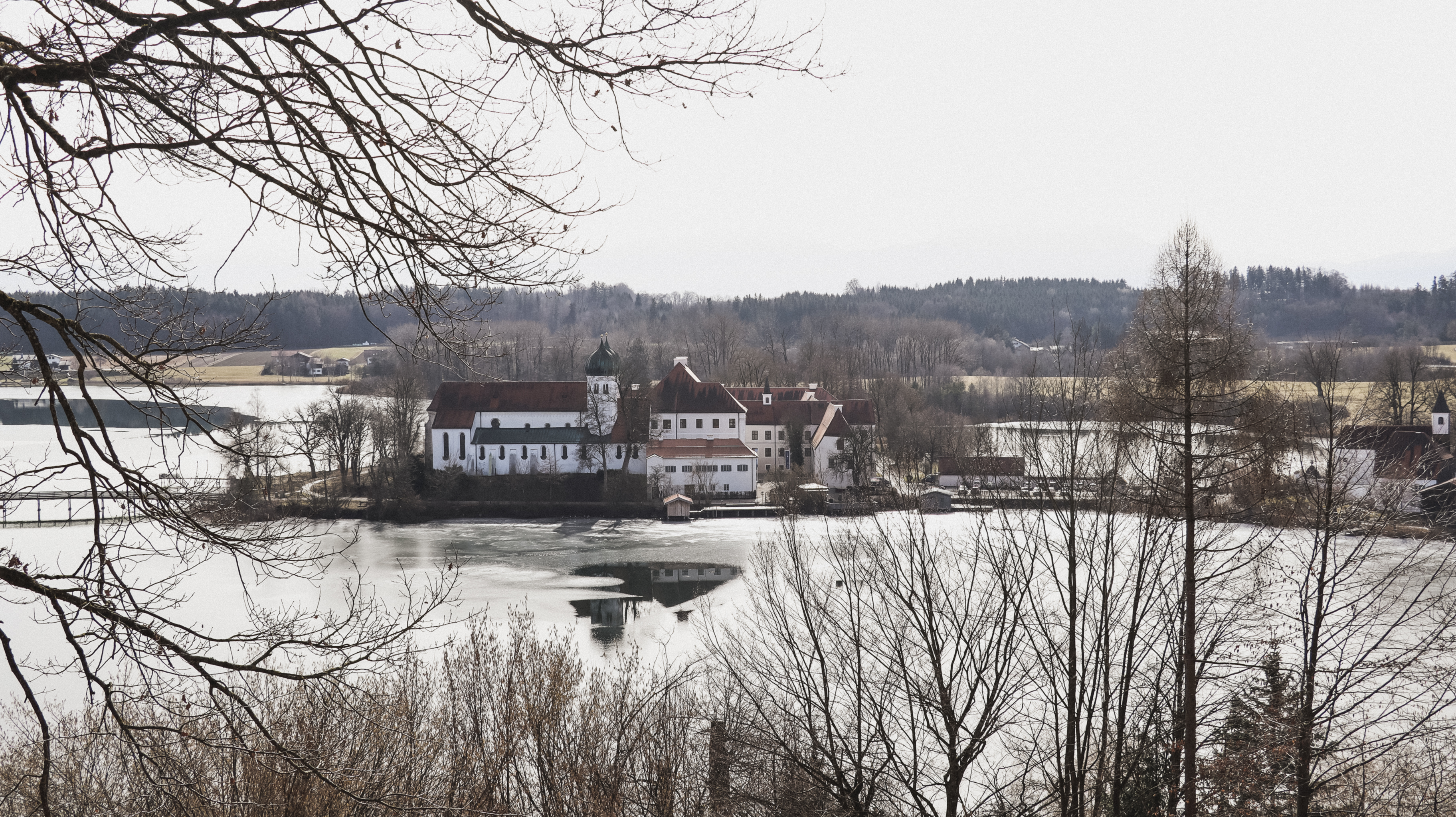 Durch den Wald hindurch biegt man im Anschluss nach links ab. Der Weg führt nun ein Stück an einer nicht befahrenen Straße entlang. Hier hält man sich links und gelangt so wieder auf einen breiteren Forstweg, der nach oben führt. Oben angekommen kann man einen schönen Abstecher zur Weinbergaussicht machen. Die paar Meter nach oben zu gehen lohnt sich in jedem Fall, da man von hier oben eine wirklich tolle Aussicht auf das Kloster Seeon und den Seeoner See hat.
